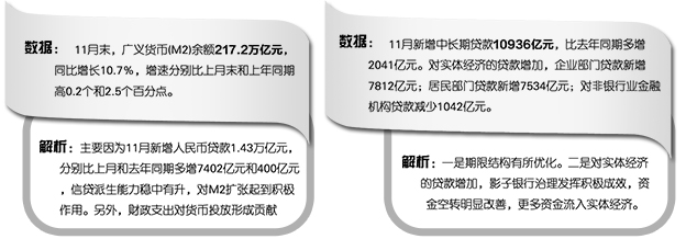 温彬分析认为,11月,新增人民币贷款比去年同期仅多增400亿元,但信贷结构有所优化,对实体经济的支持力度增强,表现在:一是期限结构有所优化,11月新增中长期贷款10936亿元,比去年同期多增2041亿元;新增短期贷款及票据融资4024亿元,比去年同期少增385亿元。二是对实体经济的贷款增加,企业部门贷款新增7812亿元,比去年同期多增1018亿元;居民部门贷款新增7534亿元,比去年同期多增703亿元;对非银行业金融机构贷款减少1042亿元,比去年同期多减1316亿元,说明影子银行治理发挥积极成效,资金空转明显改善,更多资金流入实体经济领域。