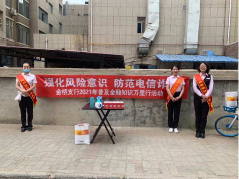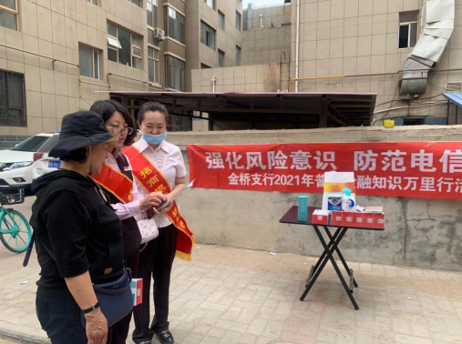 为了让更多群众了解金融知识,履行金融机构宣传的义务,招商银行金桥支行于近日走进网点周边小区,组织开展金融知识普及活动,本次宣传活动的主题是“强化风险意识 防范电信诈骗”。