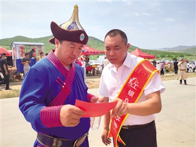工银“乌兰牧骑”扎赉特旗支行小分队成员为牧民群众讲解金融产品。