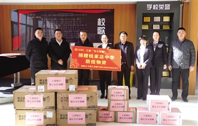 工银“乌兰牧骑”通辽经济技术开发区支行小分队为学校捐赠防疫物资。