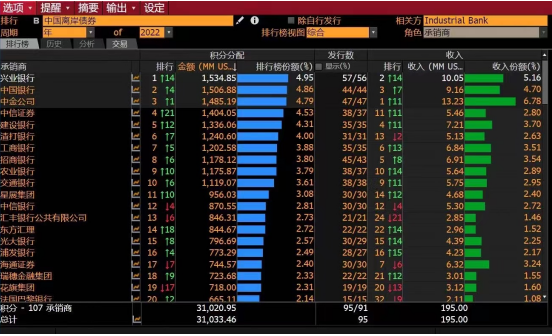 根据彭博数据显示,2022年一季度兴业银行中资离岸债券承销量全市场排名位列第一。一季度,该行充分发挥香港分行连接境内外“桥头堡”作用,共承销境外项目57笔,承销金额15.35亿美元,服务超过50家企业,协助境内企业运用境外债券发行拓宽融资渠道,搭建海外平台及实现多元化资产配置。